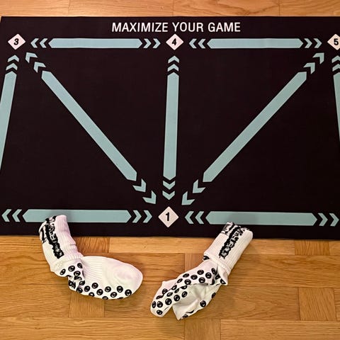 Quick Feet fotbollsträningshinder i form av en hopfällbar träningsring. Består av flera sammankopplade sektioner i svart med röda markeringar och logotyp. Produkten används för teknik- och bollkontrollträning i fotboll, till exempel passningsövningar, snabba fötter och koordination. Lämplig att använda på fotbollsplan eller annan plan yta vid individuell träning eller lagträning.