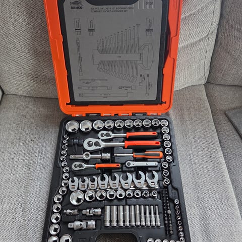 Verktygslåda med verktygssats i blå metall. Innehåller bland annat hylsnycklar med spärrskaft, fasta nycklar, tänger, skruvmejslar, måttband och olika förlängare och bits. Lådan är utfällbar med flera fack för översiktlig förvaring av verktygen och bärhandtag för enkel transport. Passar för allmänna reparations- och underhållsarbeten i hem, garage eller verkstad.