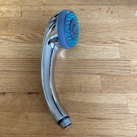 Duschset med handdusch och flexibel duschslang i kromfärg. Handduschen har flera stråltyper som ställs in med en liten spak på duschhuvudet.