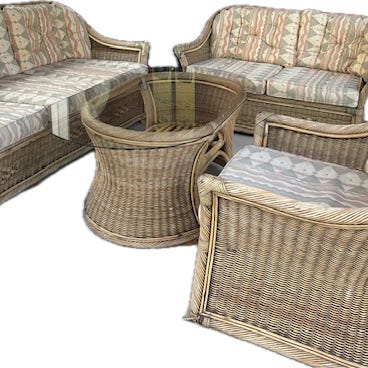 Fåtöljerna har flätad rygg och armstöd i böjd rotting. Tillhörande runt bord i rotting med glasskiva. Passar som sittgrupp i vardagsrum, uterum eller hörn i hemmet där man vill ha en lättare möbel i naturmaterial.