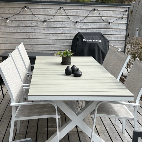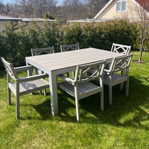 Bord och 6 stolar. Små skador men knappt synliga. Underhållsfritt. Finns svarta dynor till.