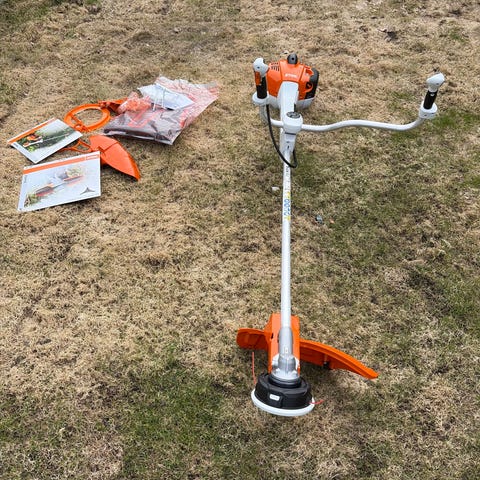 En mycket lättkörd röjsåg från kvalitetsmärket Stihl. Diverse klingor, trimmerhuvud, sele mm ingår i köpet. Finns att hämta i lasarettområdet.