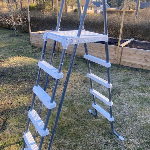Poolstege i vit metall med blå plaststeg. Avsedd för användning vid fristående pooler utomhus.