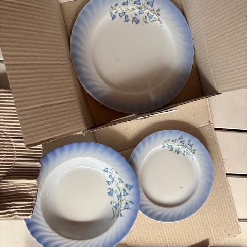 Fyrklövern porslinservis med blå blommor. Servisen består av flera delar i vitt porslin med blå dekor, däribland kaffekanna med lock, gräddkanna, sockerskål med lock, koppar och fat samt assietter. Passar för servering av kaffe, te och fika. Alla delar har samma blommönster och formgivning, vilket gör att delarna kan användas tillsammans som en enhetlig servis. 12 av varje.