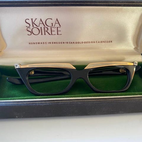 Glasögon från -50 talet av CA Bregner. Dessa är Skaga Soirée-glasögon, designade av C.A. Breger, handgjorda i Sverige med 18 karats guld och plast