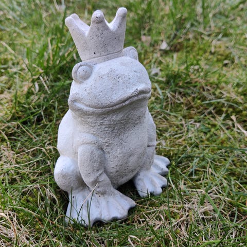 Tre grodfigurer som prydnadsföremål. Två grodor sitter på rund fot och en groda ligger platt mot underlaget. Figurerna är bruna med små kronor upptill, lämpliga som dekoration i trädgård, på altan eller balkong. Materialet är betong. Grodorna är små ca 10 cm