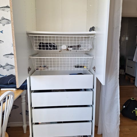 Bortskänkes två garderober (ej den med kryss, finns ej kvar) Rymliga, det finns både hyllplan och trådbackar. Fler bilder kan ordnas vid behov. Finns i centrala Falun