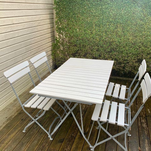 Hillerstorp Torpet trädgårdsgrupp med bord, en soffa och två stolar. Möbelgruppen är utförd i vitmålat trä. Nypris ca 7400kr. Säljes för 4900kr