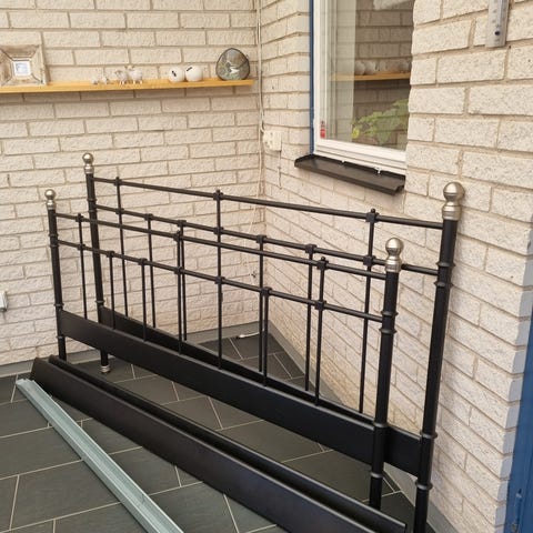 Mio säng med madrass. Sängen har en svart metallram med dekorativa detaljer i metall. Till sängen hör en ljus madrass med kviltat överdrag. Passar som enkel säng i sovrum eller gästrum. Exakta mått och modellbeteckning framgår inte av underlaget och kan vid behov mätas upp av säljaren.