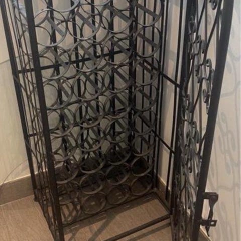 Metall vinställ i svart färg. Fristående modell med dekorativt mönster och dörr framtill. Avsett för förvaring av vinflaskor inomhus, exempelvis i kök eller vardagsrum. Passar som både praktisk förvaring och inredningsdetalj.