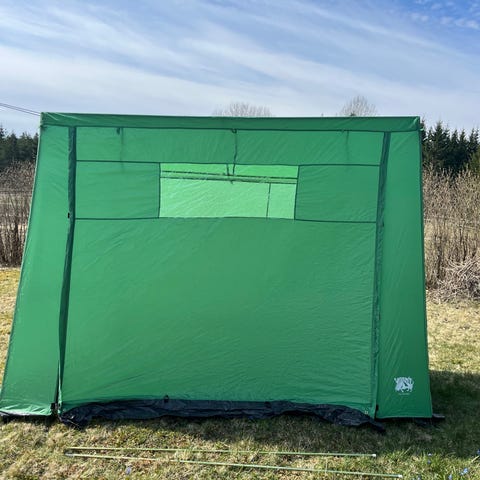 Tältet levereras med stomme, duk och bärväska. Konstruktionen består av metallstänger och ett yttertält med öppning fram och fönster i sidan. Passar som Utställningstält för hund.