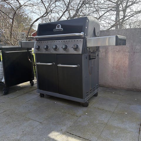 Landmann gasolgrill med 3 brännare. Grillen har lock med inbyggd termometer och front i rostfritt stål samt svart underdel med två dörrar för förvaring. Arbetsyta finns på ena sidan. Invändigt finns grillgaller i metall och värmehylla upptill. Grillen är utrustad med vred på frontpanelen för reglering av de tre brännarna. Passar för gasoldrift utomhus på altan eller i trädgård.