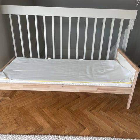 IKEA juniorsäng i trä. Sängen har ribbotten och trästomme med gavlar och enkla spjälor i huvud- och fotända. Passar som övergångssäng mellan spjälsäng och fullstor säng för barn. Madrass ingår inte om det inte anges separat i annonsen.