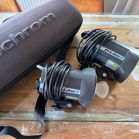 2 st blixtar med stativ, kablar, el-skyport transmitter plus, 4 st ljusformare samt 3 st reflektorer.