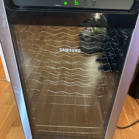 En fristående vinkyl från Samsung med en kapacitet på ca 33 flaskor och en volym på 120 liter. Den har en höjd på 850 mm, bredd på 550 mm och djup på 510 mm. Svart front och glasdörr, invändiga trådhyllor anpassade för vinflaskor. Elektronisk temperaturvisning och styrning i ovankant av dörren. Passar för förvaring och temperering av vin i hemmet eller i mindre serveringsmiljöer.