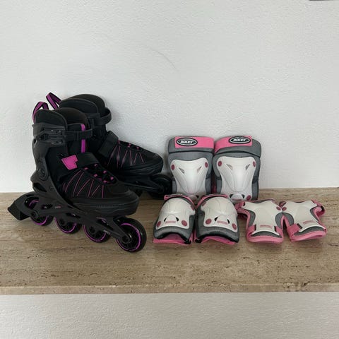 Oxelo PRST50 skyddsutrustning för rullskridskor och inlines i svart färg. Setet består av flera skydd med hårda skal och vaddering, avsedda att skydda knän, armbågar och handleder vid åkning. Levereras med nätpåse för förvaring och transport. Lämpligt som grundläggande skydd vid rullskridsko- och inlineåkning.