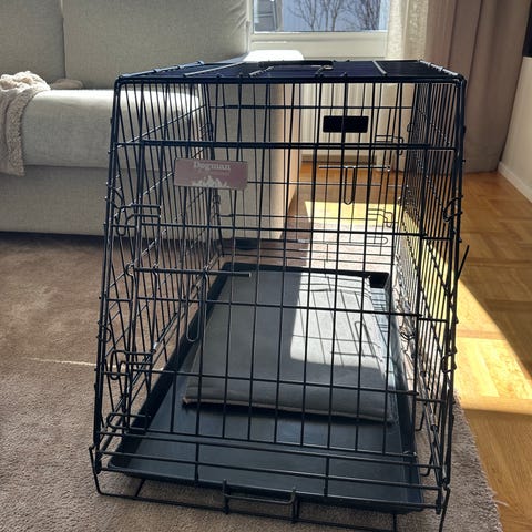 Hundbur i svart metall med gallerkonstruktion. Burens botten består av en löstagbar plastbricka som är enkel att ta ur för rengöring. Modellen är ihopfällbar för smidigare förvaring och transport. Passar för hund eller annat husdjur beroende på storlek och behov. Burens dörrar har metallås för att hålla dem stängda under användning.