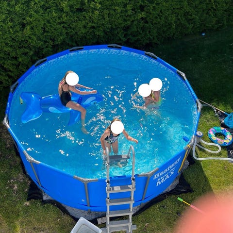 Oval fristående pool med blå liner. Poolen är inbyggd i trädäck och har metallstege för i- och urstigning. Runt poolen finns staket som avgränsning. Passar för nedgrävd eller ovanmarkinstallation på tomt eller altan, för privat bad och lek under sommarsäsong. Oval pool Alias 9,15 X 4,60 X 1,35m. Det ingår poolduk och stege. Linner måste bytas ut gick sönder i slutet av förra säsongen. Köpare får montera ner poolen själv. Det finns massor med reserv delar till stommen.