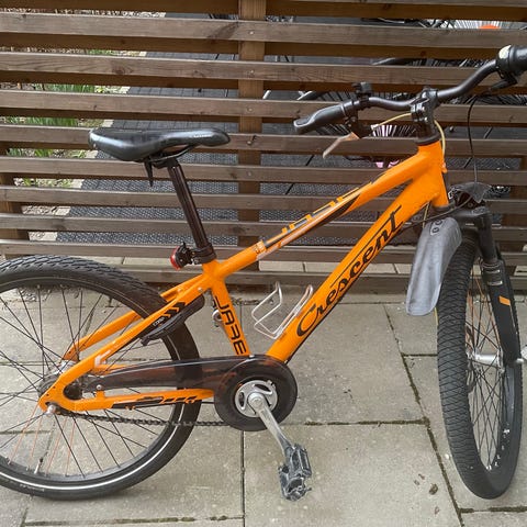 Crescent barncykel 7 växlad med 24" hjul i grå och orange färg. Cykeln har fotbroms, rak styre, sadel anpassad för barn samt däck med mönster som passar för både asfalt och enklare grusvägar. Utrustad med framgaffel med fjädring, pedaler med reflexer och bakskärm. Lämplig som vardagscykel för barn i åldern där 24" hjulstorlek passar.