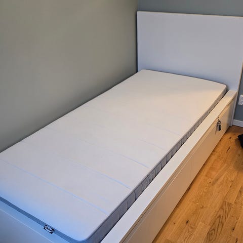 IKEA säng Brimnes med förvaring i vit, inklusive Sultan madrass. Madrasa använd men mycket bra skick, alltid använt bäddmadrass över. Sångtalang är fullt funktionell men har lite skråmor i lacken och små defekter på några ställen. Inget som stör. Se bilder.