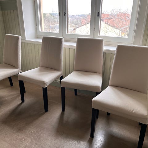4 st IKEA Henriksdal barstolar i mörkbrunt trä med ljus avtagbar (tvättad) klädsel. Passar för köksö, sitshöjd 63 cm.