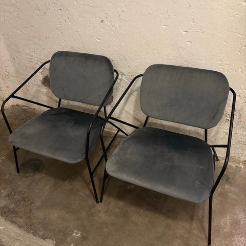 Två stycken fåtöljer/stolar i grön/turkos sammet. Svarta ben.
