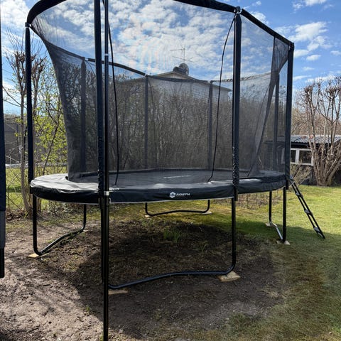 Berg Favorit studsmatta i runt utförande med grön kantlist. Studsmattan är avsedd för utomhusbruk och står på metallben. Ramen är upphöjd från marken och hoppduken är omgiven av en vadderad kant för att täcka fjädrarna. Stolpar runt ramen är avsedda för montering av säkerhetsnät. Passar för hopp och lek i trädgård.