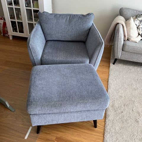 Säljer en fåtölj, modellen Ebba från Mio. Klädd i mörkblått sammetstyg.