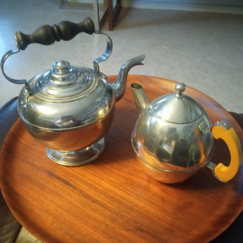 Kaffekanna med tillhörande sockerskål och gräddkanna i nysilver.