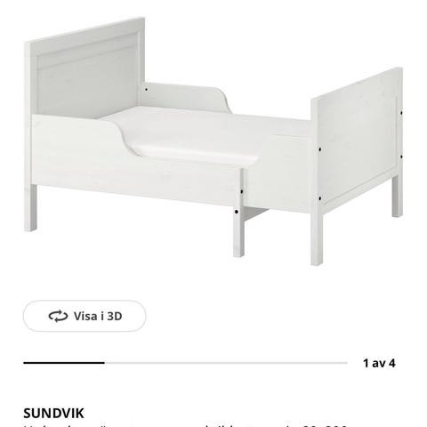 IKEA juniorsäng i rosa och vit färg. Sängen har gavlar med utskurna hjärtan och en vit underdel med utdragbar låda som kan användas för förvaring. Modellen är anpassad för barn som växt ur spjälsäng och passar i ett mindre sovrum eller barnrum. Konstruktionen är i träbaserat material med målade ytor. Sängen ger en låg ligghöjd som underlättar för barnet att själv ta sig i och ur sängen.