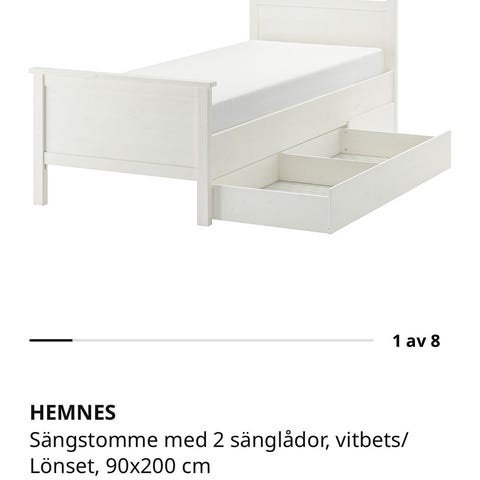 IKEA säng med förvaring i vit färg. Sängen har huvudgavel och fotgavel i trä med klassisk, rak design. Under sängen finns utdragslådor som ger extra förvaringsutrymme.