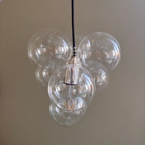 Taklampa från CO Bankeryd, modell Tage i vitt. Ena kupan har en spricka men har en reservkapacitet som medföljer om man vill byta men inget måste. Lampan är dammig på bilderna. Man får montera egen stickkontakt då jag använde den till min nya lampa.