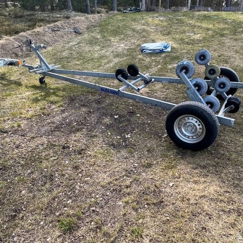Båtvagn med dubbelaxel i stålram. Vagnen är utrustad med flera rullar för att underlätta upptagning och sjösättning av båt. Fram finns stödhjul och koppling för dragkrok. Nya däck, hjullager, winchvajer och kölrullar.