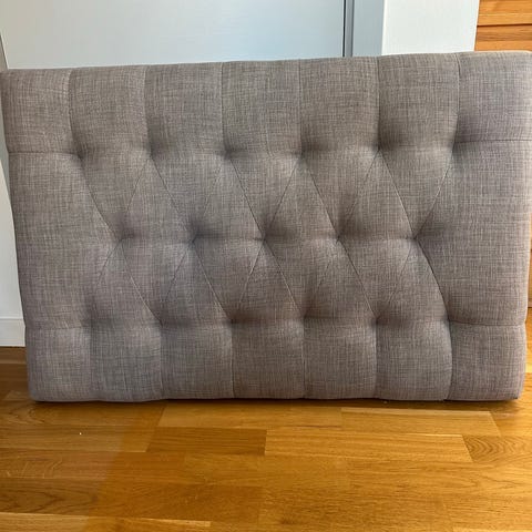 Mio sänggavel i grå textilklädsel. Gaveln har vadderad framsida med horisontella respektive rutformade sömmar och står på runda ben i metall. Passar som huvudgavel till säng och ger stöd bakom kuddar vid sittande läge. Neutral grå färg som fungerar tillsammans med många olika sängar och sovrumsstilar. Passar till 140 cm säng. Hämtas i Fredhäll på Kungsholmen.