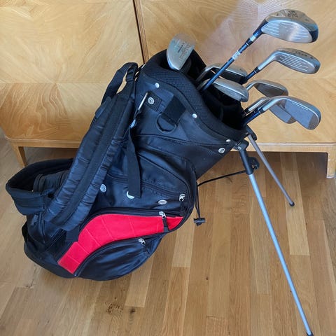 Cobra King JR golfset med bag. Setet innehåller flera järnklubbor och metalwoods med svarta skaft. Klubborna levereras tillsammans med en bärbag med benstativ, bärremmar och flera förvaringsfickor. Passar för juniorer som söker ett komplett set med både klubbor och bag för spel på bana eller träning på range.