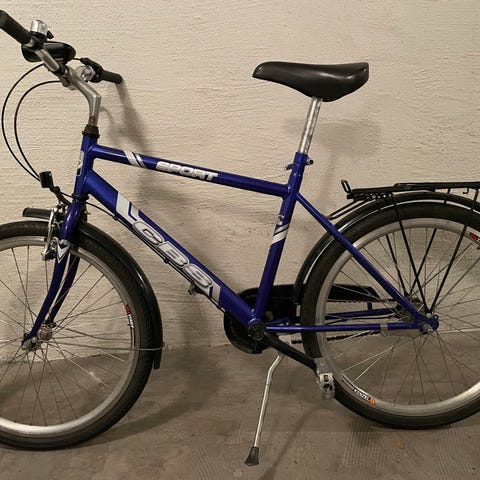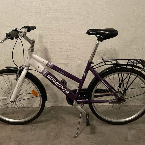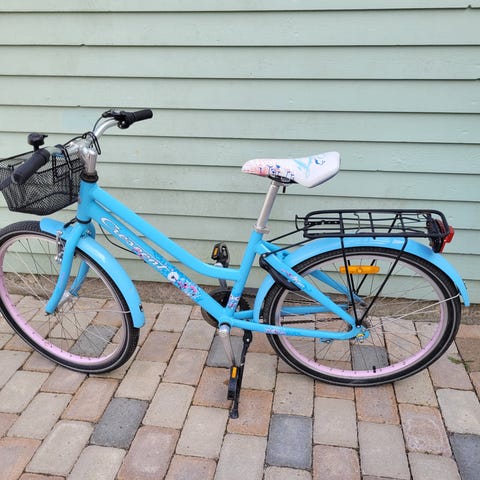 Barncykel med 24-tums hjul. Cykeln är utrustad med en cykelkorg fram och en pakethållare bak. Den har även en fotbroms och handbroms. Välvårdad men kan behöva en tvätt.