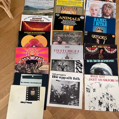 Samling vinylskivor LP med blandade artister och album. Flera olika genrer och utgivningsår. Skivorna säljs tillsammans som ett parti. Passar för den som vill utöka sin samling av vinyl med olika artister och stilar.