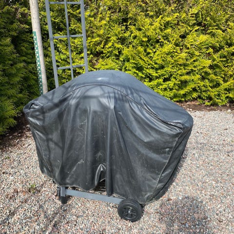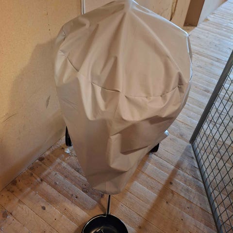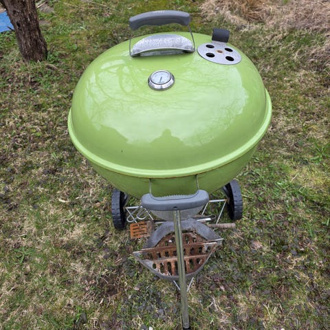Weber klotgrill i grön färg med lock och inbyggd termometer. Grillen står på benställning med hjul och har ventiler i lock och botten för reglering av luftflöde. Till grillen hör ett anpassat överdrag som skyddar mot väder. På bilderna syns även askuppsamlare och enklare grillredskap som ingår tillsammans med grillen.