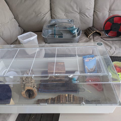 Smådjursbur med genomskinligt plastlock och gallerfront, anpassad för mindre gnagare, t.ex. hamster, dvärghamster. Burens front har två öppningar för anslutning av rörsystem. Till buren hör flera genomskinliga plaströr med böjar och kopplingar för att bygga gångar och tunnlar till din lilla kompis, + andra tillbehör. Oöppnad vattenflaska på 125 ml med fäste för montering på buren.