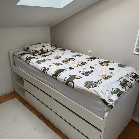 Hög säng med gott om förvaring. Fulldjupa lådor under. Madrassmått 90 x 200. Längd 205 cm. Höjd 100 cm. Vi har köpt till ett extra fallskydd som syns på bild och som hålls fast av madrassen, medföljer. Madrass ingår inte.