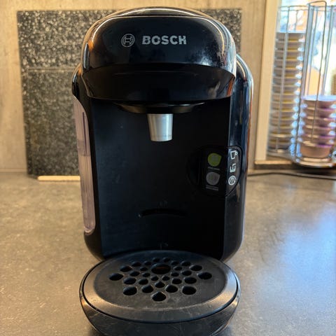Kaffemaskin från Bosch, modell Tassimo. Maskinen är svart och har en kompakt design. Den är utrustad med en strömkabel.