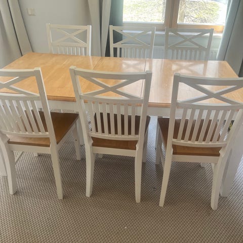 Säljer en mycket fin och komplett Wilma matgrupp från Mio. Stilren och tidlös modell med vita ben och ekskiva som passar i de flesta hem.