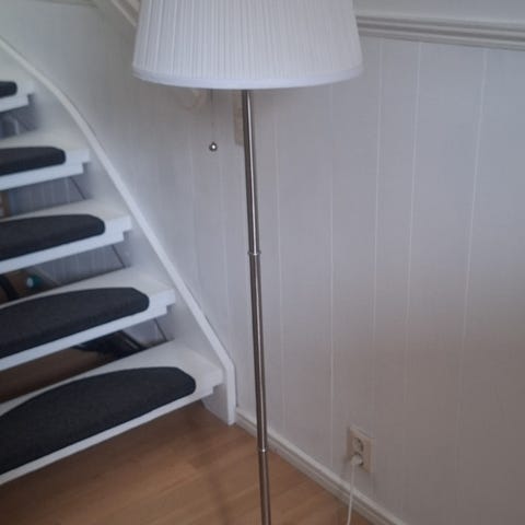 Ikea bordslampa med fot och ställning i metall och vit, veckad lampskärm i textil. Lampan har dragströmbrytare med kedja under skärmen. Passar som sänglampa, läslampa eller allmän belysning i sovrum och vardagsrum. Används med standard glödlampa eller LED-lampa med passande sockel.