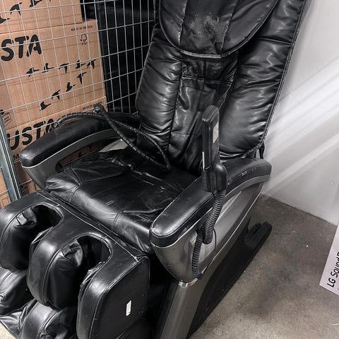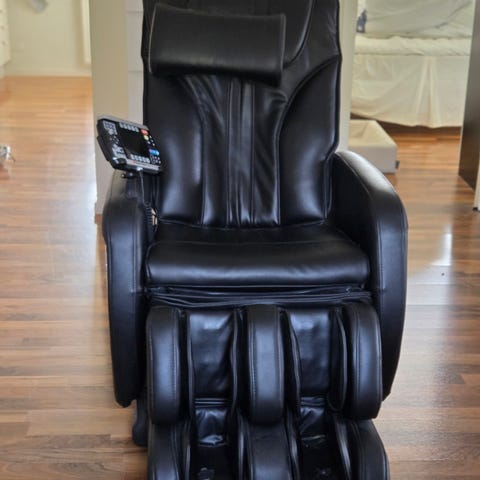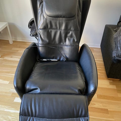 Massagefåtölj i svart läder. Elektrisk massagefåtölj med inbyggt fot- och benstöd samt fjärrkontroll för styrning av olika funktioner och program. Klädsel i svart läderliknande material och stoppad sits, rygg och armstöd för ökad komfort. Passar som vilofåtölj i vardagsrum, kontor eller relaxutrymme. Obs. En knöl är lite seg.