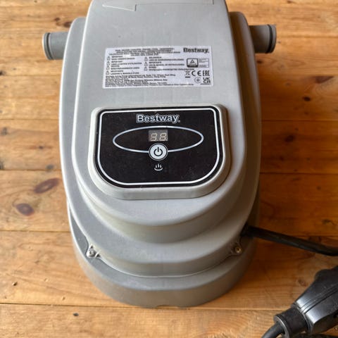 Bestway H100101 poolvärmare för uppvärmning av poolvatten. Enheten drivs med 220–240V~ 50Hz och har en effekt på 2000W. Skyddsklass IPX5. Utrustad med elkabel med kontrollenhet samt anslutningar för in- och utlopp av vatten. Avsedd att kopplas till kompatibelt filtersystem enligt tillverkarens anvisningar. Lämplig för användning utomhus vid uppvärmning av mindre pooler där elektrisk poolvärmare rekommenderas av tillverkaren.