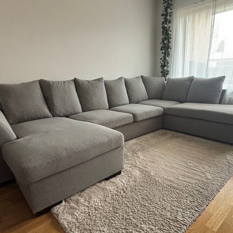 Grå soffa bortskänkes. Soffan har några skavanker. En dragkedja är trasig (se bild) och det finns en spricka i träet ungefär i mitten av soffan (se bild). Tidigare ägare har satt ett träblock undertill som gör att soffan blir mer stabil.