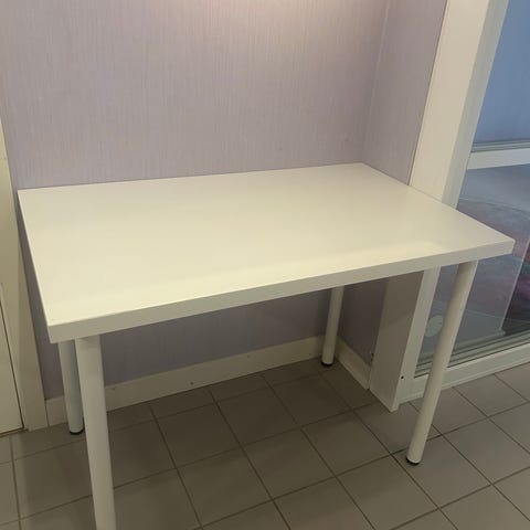 Hopfällbart bord som används som provisoriskt skrivbord. Går enkelt allt fälla ihop och är vitt. Mindre skavanker förekommer (se bilder).