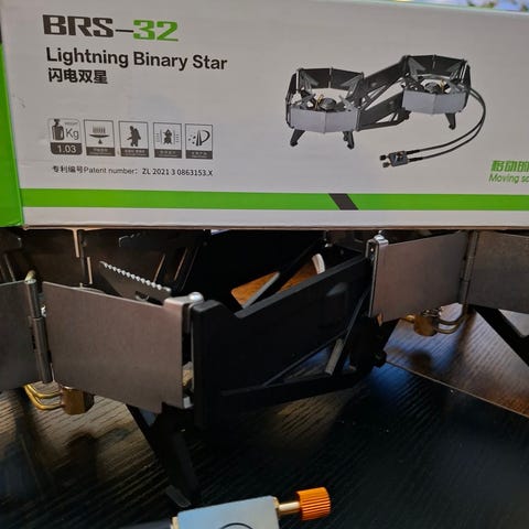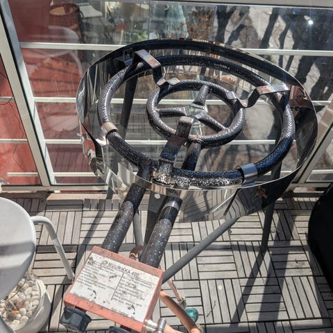 Stekhäll med gasbrännare och stativ för utomhusmatlagning. Setet består av en stor paella-panna och en rejäl stekhäll från Hällmark.