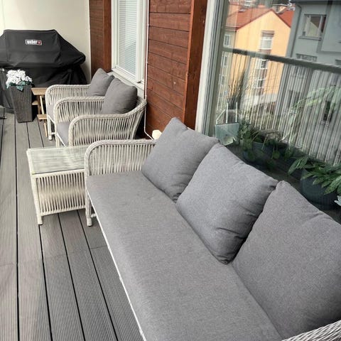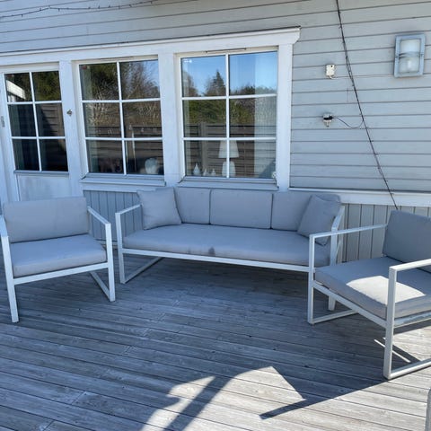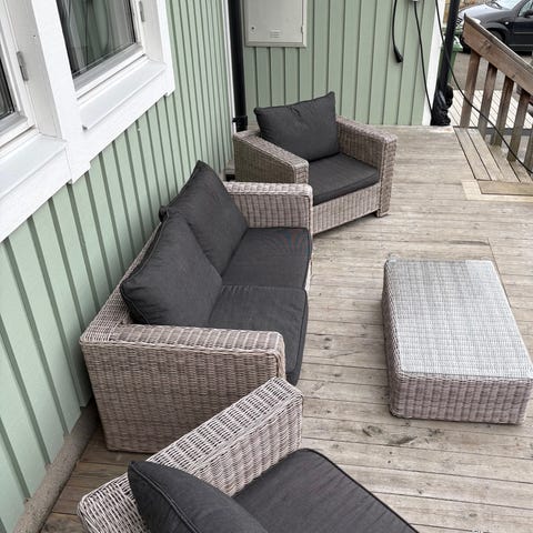 Utemöbelgrupp bestående av en soffa och två fåtöljer i grå konstrotting med grå dynor. Till gruppen hör ett rektangulärt bord i samma material. Möblerna är avsedda för utomhusbruk, exempelvis altan, balkong eller uteplats. Dynorna är tjocka för bättre sittkomfort och klädseln är i en neutral grå färg som är lätt att kombinera med andra textilier och detaljer.
