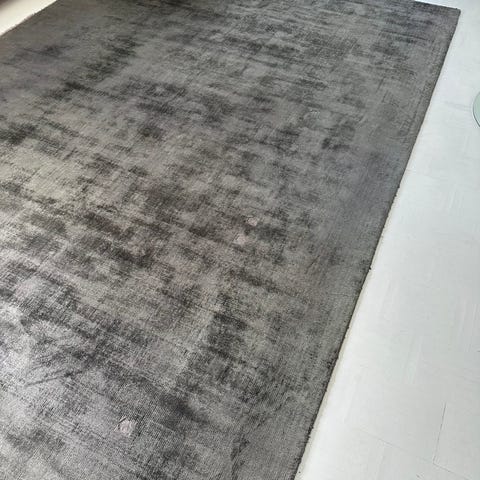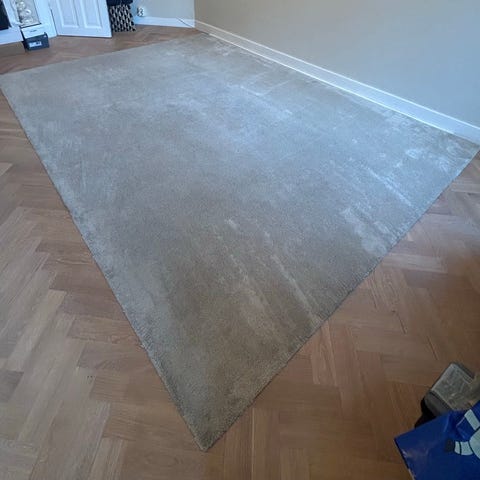 Rugvista ullmatta i grå ton. Enfärgad, tätvävd matta som passar exempelvis i vardagsrum, sovrum eller hall. Rektangulär form med slät ovansida och vävd undersida. Märkt med Care & Fair-etikett. Nypris 9500kr.